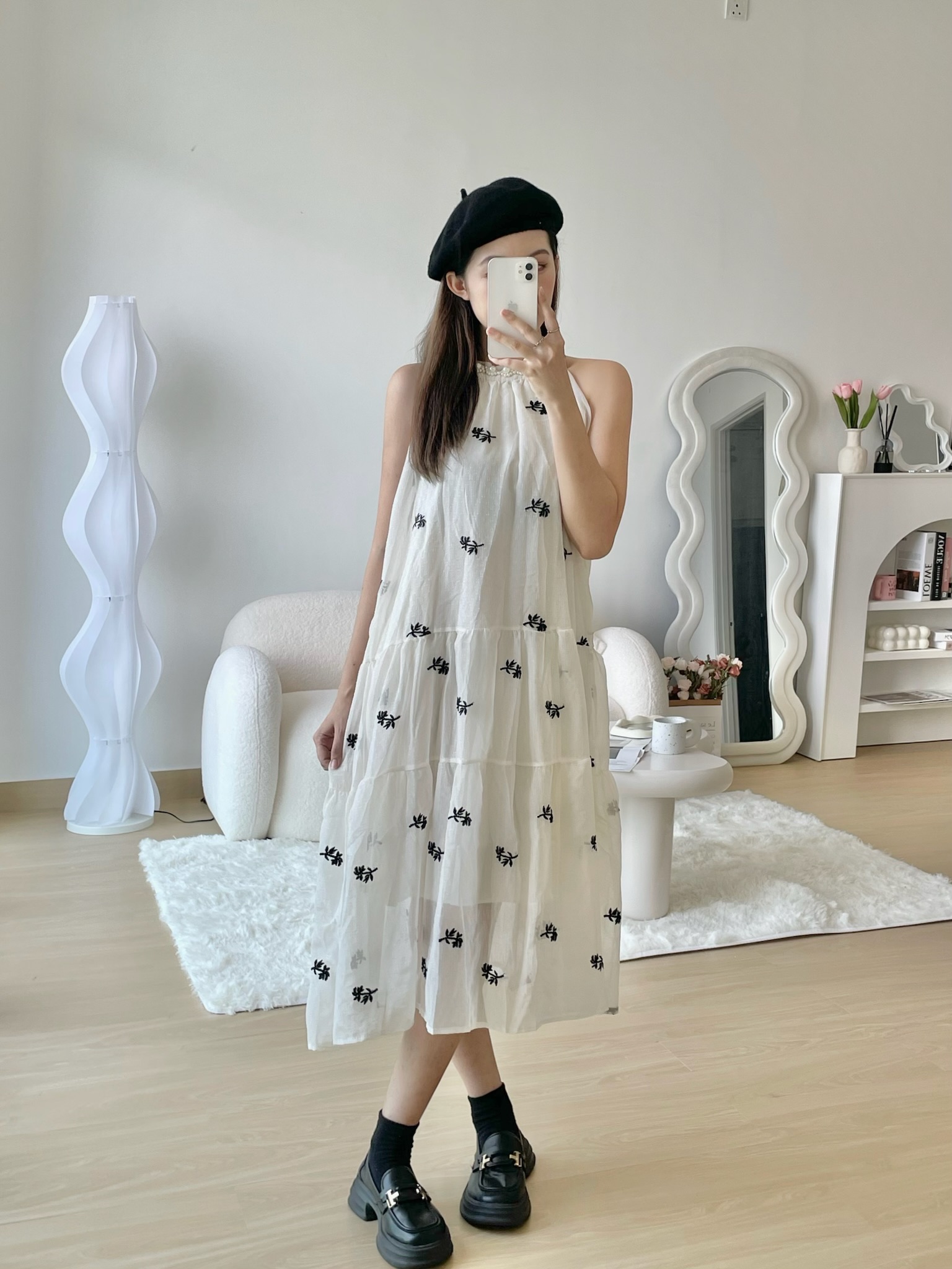 This elegant dress features delicate embroidery and a pearl-embellished neckline. It comes in two styles: one with white butterfly embroidery and the other with bold black floral accents.